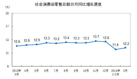 中国发展门户网讯 据国家统计局网站消息,2014年3月份,社会消费品零售总额19801亿元,同比名义增长12.2%(扣除价格因素实际增长10.8%,以下除特殊说明外均为名义增长)。其中,限额以上单位消费品零售额10231亿元,增长10.2%。1-3月份,社会消费品零售总额62081亿元,同比增长12.0%。其中,限额以上单位网上零售额[1]815亿元,增长51.7%。