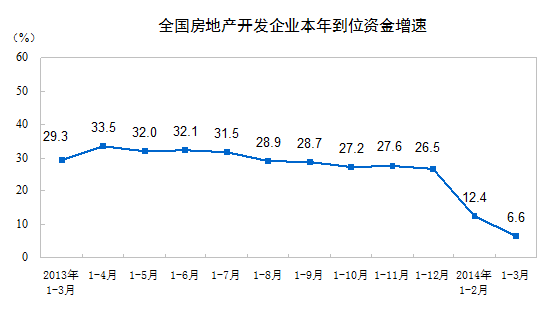 1-3月份,房地产开发企业到位资金28731亿元,同比增长6.6%,增速比1-2月份回落5.8个百分点。其中,国内贷款6226亿元,增长20.4%;利用外资84亿元,下降33.9%;自筹资金11093亿元,增长9.6%;其他资金11327亿元,下降1.9%。在其他资金中,定金及预收款6837亿元,下降3.6%;个人按揭贷款3161亿元,增长0.1%。