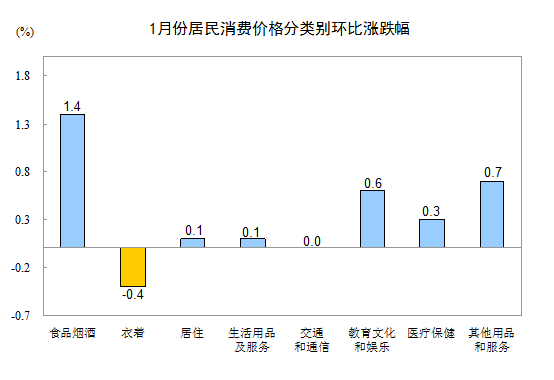 1月份,其他七大类价格环比五涨一降一平。其中,其他用品和服务、教育文化和娱乐、医疗保健、居住、生活用品及服务价格分别上涨0.7%、0.6%、0.3%、0.1%、0.1%;衣着价格下降0.4%;交通和通信价格持平。