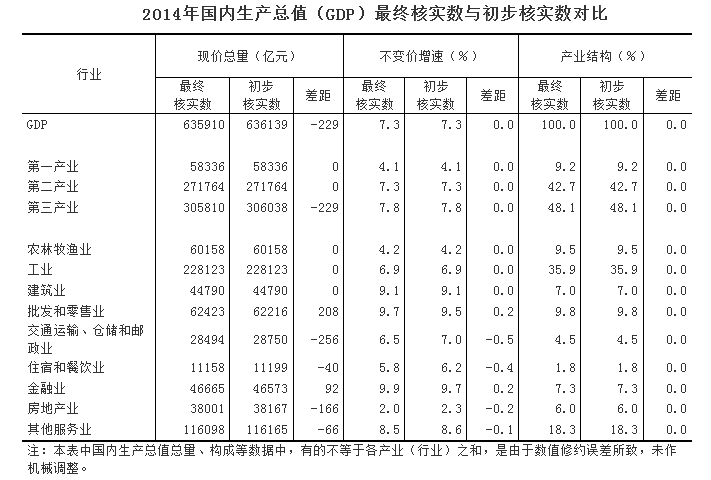 经最终核实,2014年GDP现价总量为635910亿元,比初步核实数减少229亿元;按不变价格计算,比上年增长7.3%,与初步核实数一致。各行业数据见附表。