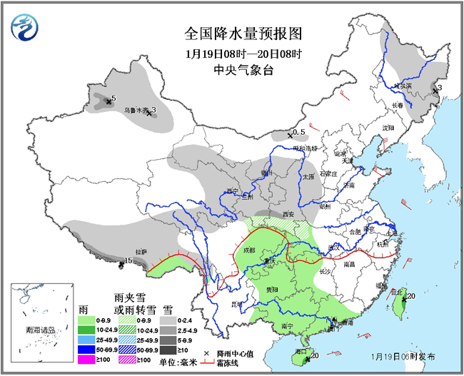 19日08时至20日08时,新疆北部、黑龙江中东部、吉林东部、山东半岛、西北地区中东部、华北西部、江汉西部、西藏中南部等地有小到中雪或雨夹雪,其中,新疆伊犁河谷、西藏南部等地的部分地区有大雪,局地暴雪(10~15毫米);西南地区东部、江南西部、华南大部、台湾等地的部分地区有小雨或阵雨,海南东部的部分地区有中雨。内蒙古中部、辽东半岛、山东半岛等地有4~6级风。黄海东部、东海东北部、台湾海峡、南海东北部有7~8级、阵风9级的偏北风。