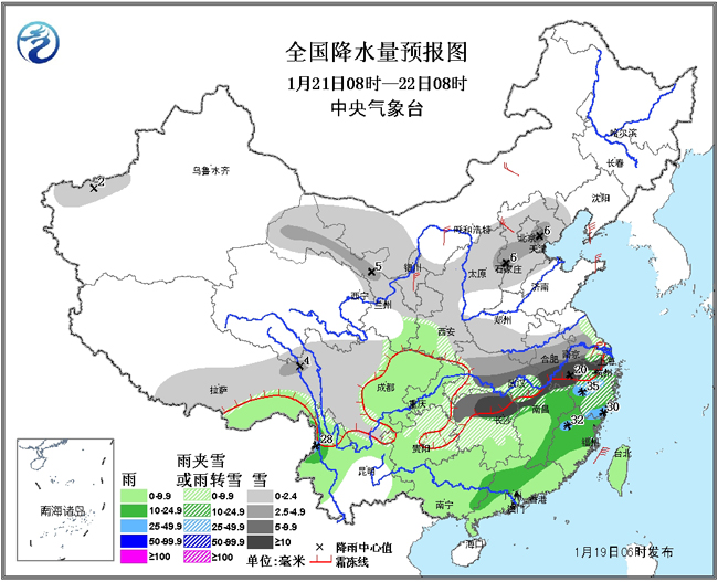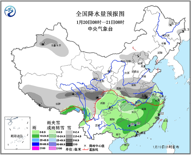 20日08时至21日08时, 新疆北部、内蒙古中部、西藏大部、川西高原大部、青海东部、甘肃中南部、陕西南部、华北北部和南部、黄淮中西部、江淮、江汉、江南北部等地有小到中雪或雨夹雪,其中,新疆伊犁河谷、西藏东北部和南部、川西高原北部、湖北北部、安徽中部等地的部分地区有大雪,局地暴雪(10~15毫米);西藏东南部、西南地区东部、云南西北部和东南部、江南中南部、华南、台湾等地有小到中雨,其中,广西东北部、广东北部、西藏东南部、云南西北部等地局地有大雨。内蒙古中部、辽东半岛、山东半岛等地有4~6级风。台湾海峡、巴士海峡、南海东北部有7~8级、阵风9级的东北风。