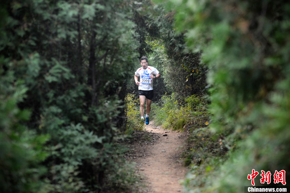 9月28日,一名选手在北京西山国家森林公园参加2013北京山地马拉松。当日北京再次遭遇雾霾天,空气污染较严重。 刘震 摄
