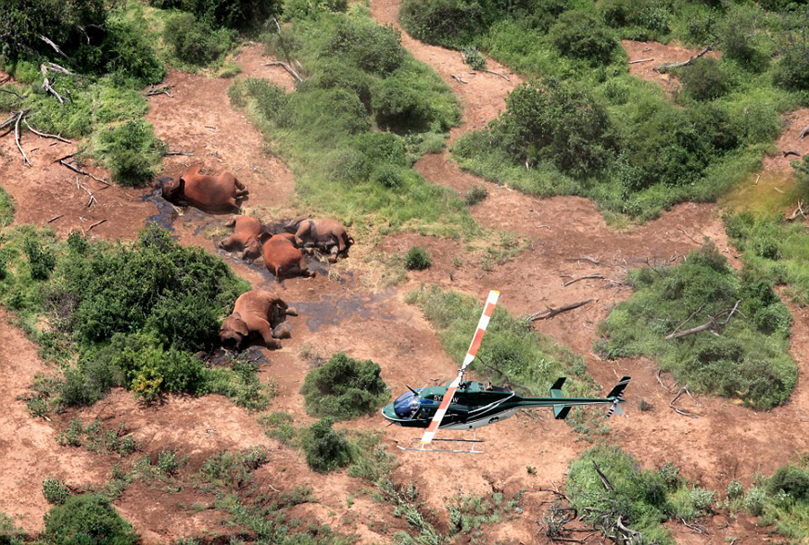 英国《每日邮报》刊登了一组航拍照片,展示了今年一月份肯尼亚察沃(Tsavo)保护区11头大象被屠杀的画面。从照片中可以看到,这些大象惨遭毒杀,象牙被拔,惨不忍睹。