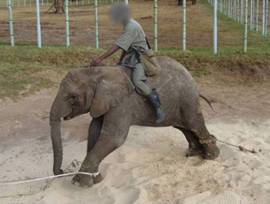国际在线专稿:据英国《每日邮报》5月21日报道,动物权利组织“爱护动物协会”(SPCA)近日公布视频,曝光了南非克尼斯纳大象公园中驯兽师残酷驯象的场景。幼象被锁链锁住,遭到电击或铁钩击打,双腿浮肿、皮肤多处溃烂,虚弱不堪。