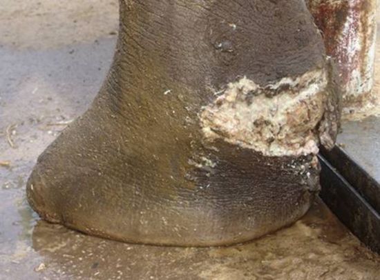 幼象被锁链锁住,遭到电击或铁钩击打,双腿浮肿、皮肤多处溃烂,虚弱不堪。