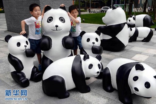 6月2日,两名小朋友在上海静安嘉里中心广场内和“熊猫”合影。 当日,“1St panda”熊猫展在上海静安嘉里中心广场开幕,100只萌态百出的“熊猫”集体亮相,惹人喜爱。据悉,这些“大熊猫”由毛竹的边角料制作而成,旨在唤起人们重视环境保护。新华社发(赖鑫琳摄)