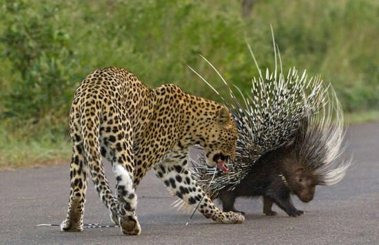 国际在线专稿:据英国《每日邮报》6月3日报道,南非摄影师克雷格·斯克里亚宾曼(Craig Schraibman)抓拍到一场别开生面的战斗,一只饥饿猎豹试图捕食一头豪猪当晚餐。然而长满全身的坚硬利刺成为豪猪的天然防御,在攻击了近一个小时后,猎豹反被多处刺伤,被迫放弃捕猎。