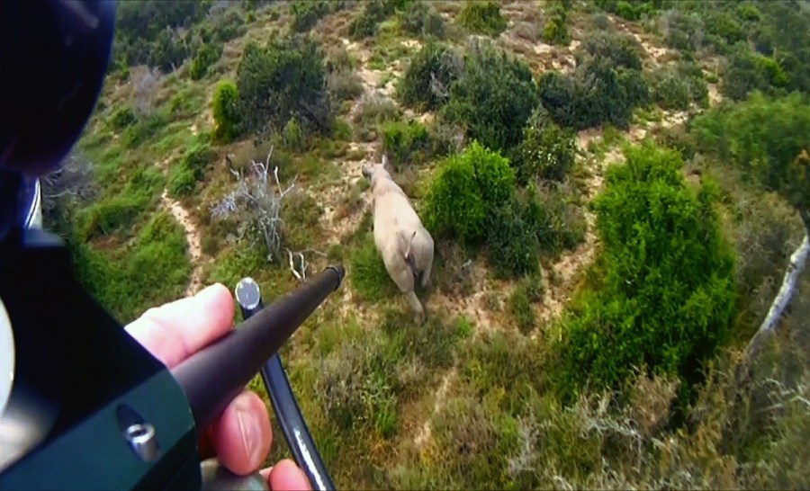 2014年8月7日消息,南非东开普敦,当地保护人员通过直升机吊运的方式给犀牛“搬家”。