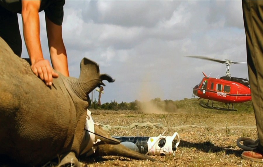 2014年8月7日消息,南非东开普敦,当地保护人员通过直升机吊运的方式给犀牛“搬家”。