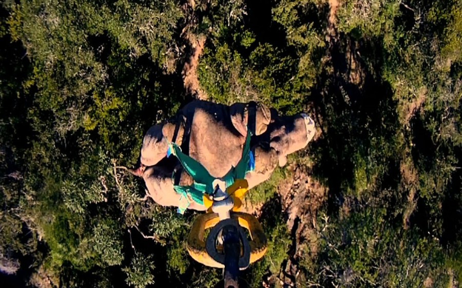 2014年8月7日消息,南非东开普敦,当地保护人员通过直升机吊运的方式给犀牛“搬家”。