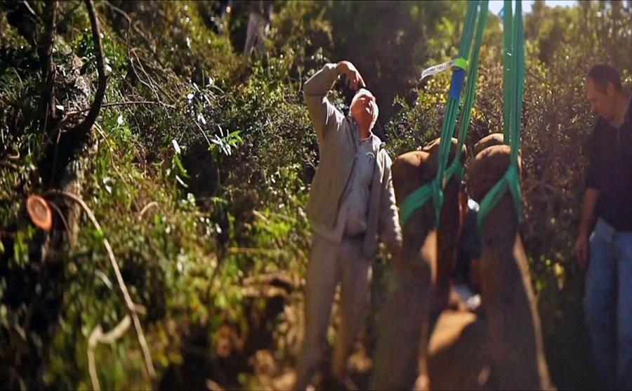 2014年8月7日消息,南非东开普敦,当地保护人员通过直升机吊运的方式给犀牛“搬家”。