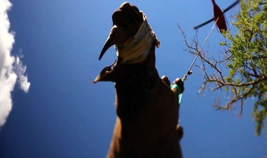 2014年8月7日消息,南非东开普敦,当地保护人员通过直升机吊运的方式给犀牛“搬家”。