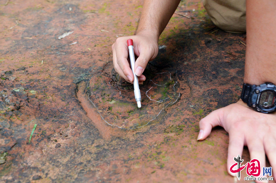 2014年9月15日,专家在四川省泸州市叙永县大石乡龙井村发现的蜥脚类恐龙足迹。 中国网图片库刘传福摄影