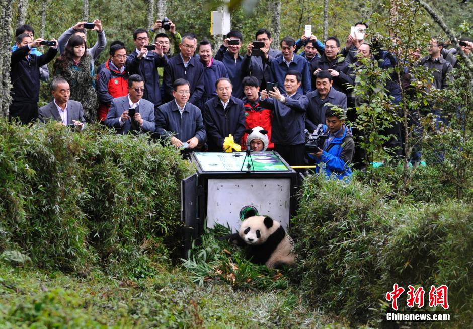 10月14日,由国家林业局和四川省人民政府共同举办的大熊猫“雪雪”放归自然活动在四川雅安栗子坪国家级自然保护区举行,2岁零2个月的大熊猫“雪雪”走出放归笼,回归大自然。这是继大熊猫“祥祥”、“淘淘”和“张想”放归之后,我国放归的第四只人工繁育的大熊猫。安源摄