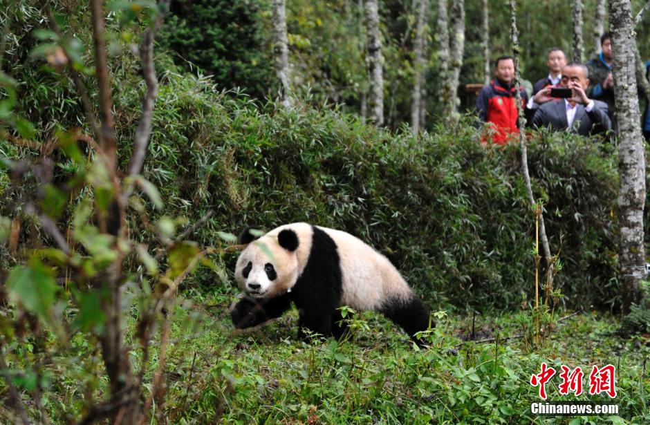 10月14日,由国家林业局和四川省人民政府共同举办的大熊猫“雪雪”放归自然活动在四川雅安栗子坪国家级自然保护区举行,2岁零2个月的大熊猫“雪雪”走出放归笼,回归大自然。这是继大熊猫“祥祥”、“淘淘”和“张想”放归之后,我国放归的第四只人工繁育的大熊猫。安源摄