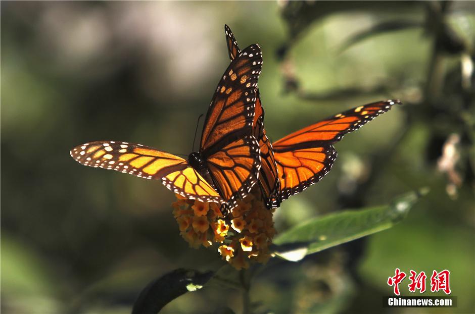 图为2014年12月30日,美国加州一个植物园里的黑脉金斑蝶。