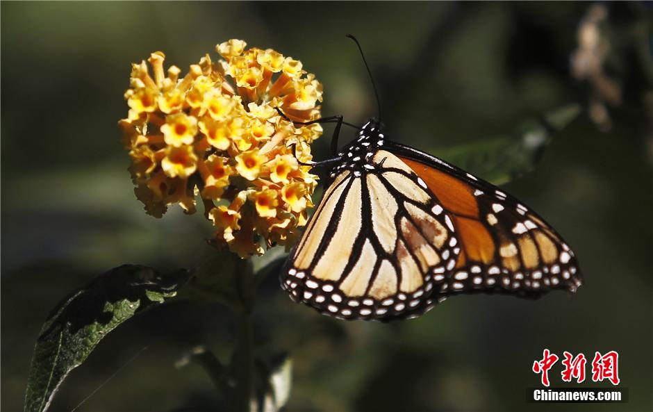 图为2014年12月30日,美国加州一个植物园里的黑脉金斑蝶。