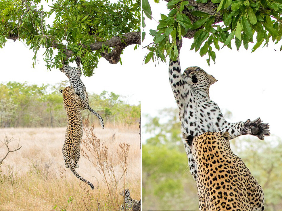 南非小幼豹树枝上玩耍 母豹跳起3米将其抓到地面