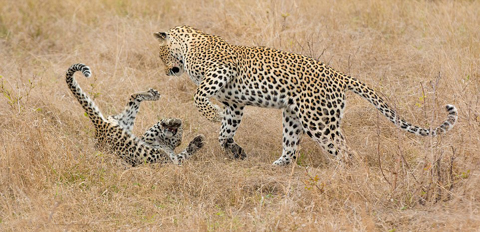 南非小幼豹树枝上玩耍 母豹跳起3米将其抓到地面