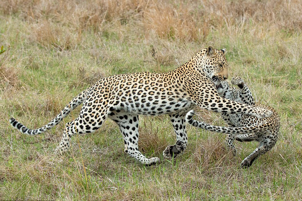 南非小幼豹树枝上玩耍 母豹跳起3米将其抓到地面