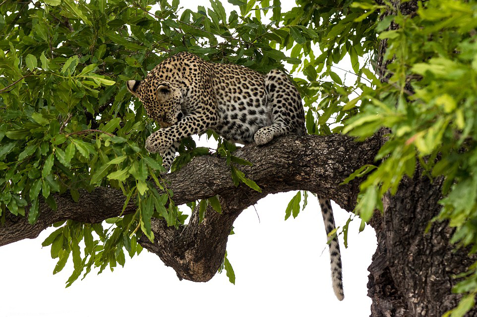 南非小幼豹树枝上玩耍 母豹跳起3米将其抓到地面