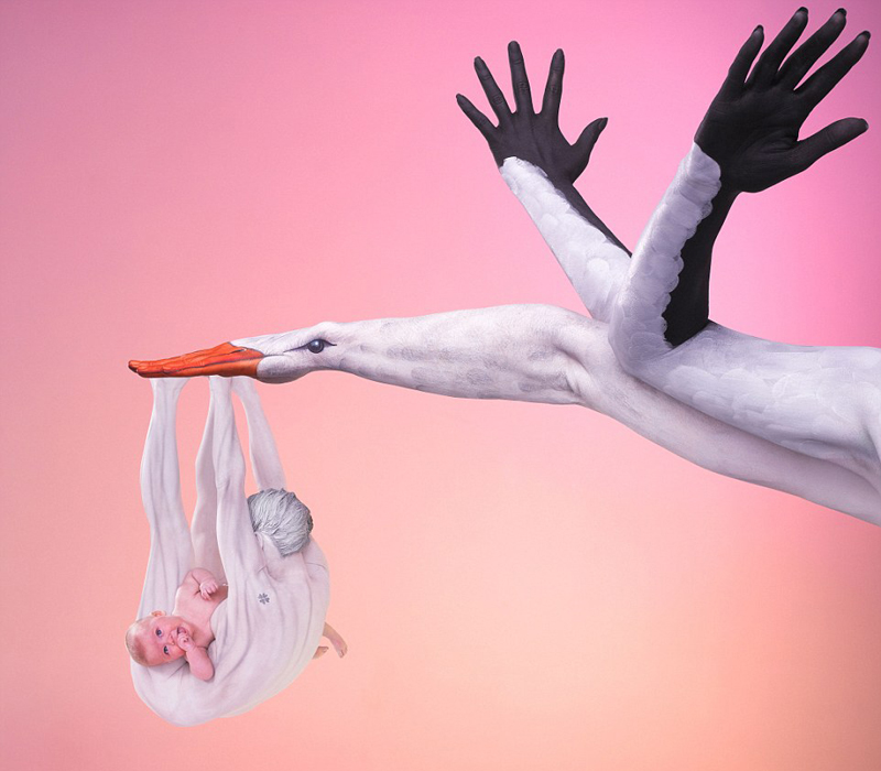 英国人体彩绘艺术家凯特·迪恩创造的人体彩绘鸟类造型图之一,展现嗷嗷待哺的婴儿。(网页截图)
