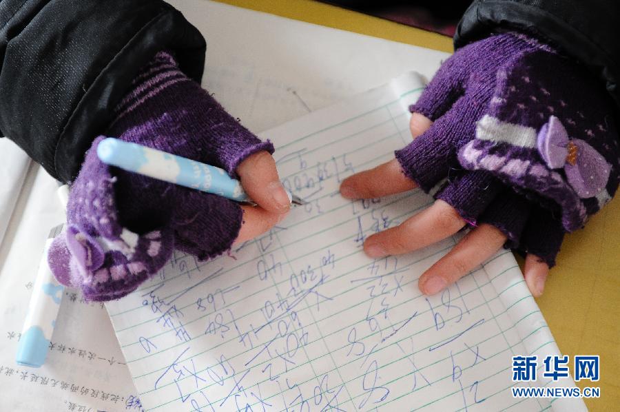 江苏省响水县实验小学四(7)班的同学上课时带着手套御寒(1月7日摄)。