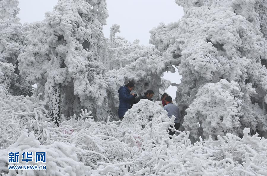2月1日,游客在南岳衡山上游览。连日来,持续的冰冻天气让位于湖南衡阳的南岳衡山呈现银装素裹的北国风光,群山树木被冰雪覆盖,美不胜收。新华社发(曹正平 摄)