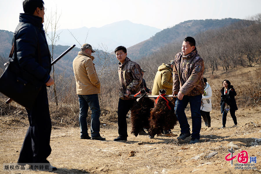 2015年2月1日上午,山东黑虎山狩猎场,标主在导猎人员的陪同下,全副武装在狩猎区打响了黑虎山狩猎场“第一枪”,工作人员抬着战利品满载而归。陈为峰摄影中国网图片库