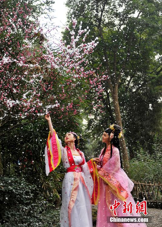 成都杜甫草堂梅花绽放 民众着古装赏梅花