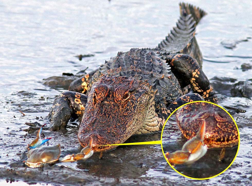 勇敢的螃蟹把鳄鱼的鼻子猛夹了一下,后者惊呆了。