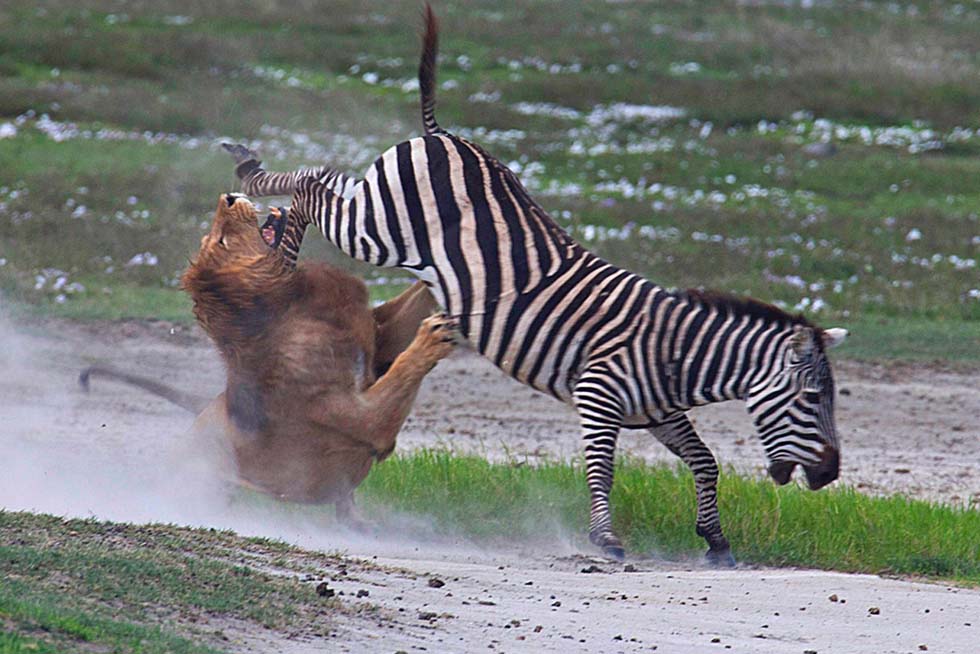 坦桑尼亚的这只猛狮显然没料到自己会被斑马踹上一脚。
