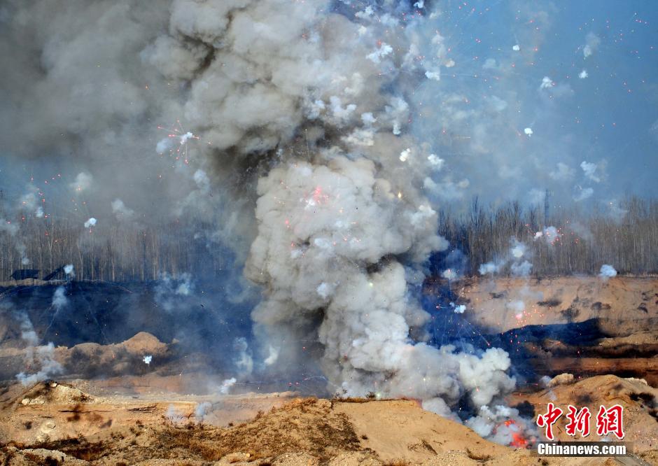 2月5日下午,石家庄公安局举行“集中销毁烟花爆竹行动”,将收缴的10987件非法烟花爆竹和910公斤原材料,分批次销毁引爆。中新社发翟羽佳 摄
