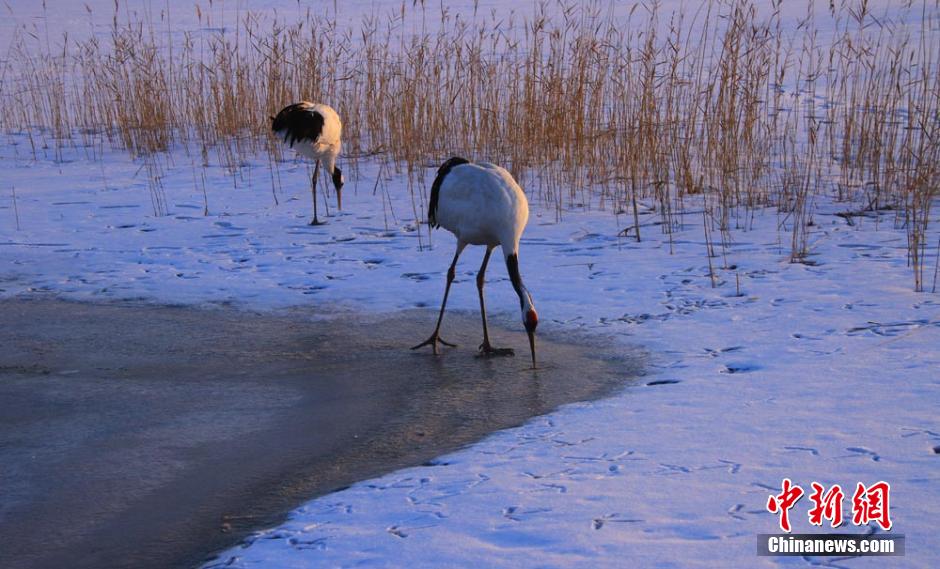 2月9日,伴着朝阳,国家一级保护动物丹顶鹤在地处甘肃河西走廊的张掖国家湿地公园“闲庭散步”、“起舞”游玩。2014年3月,张掖国家湿地公园从黑龙江齐齐哈尔扎龙自然保护区引进14只国家一级保护动物丹顶鹤和2只白头鹤。经过近一年的适应期、合群期,现在有11只丹顶鹤进入放飞期。随着羊年春节的到来,丹顶鹤开始放飞并与游人见面。(陈礼摄)