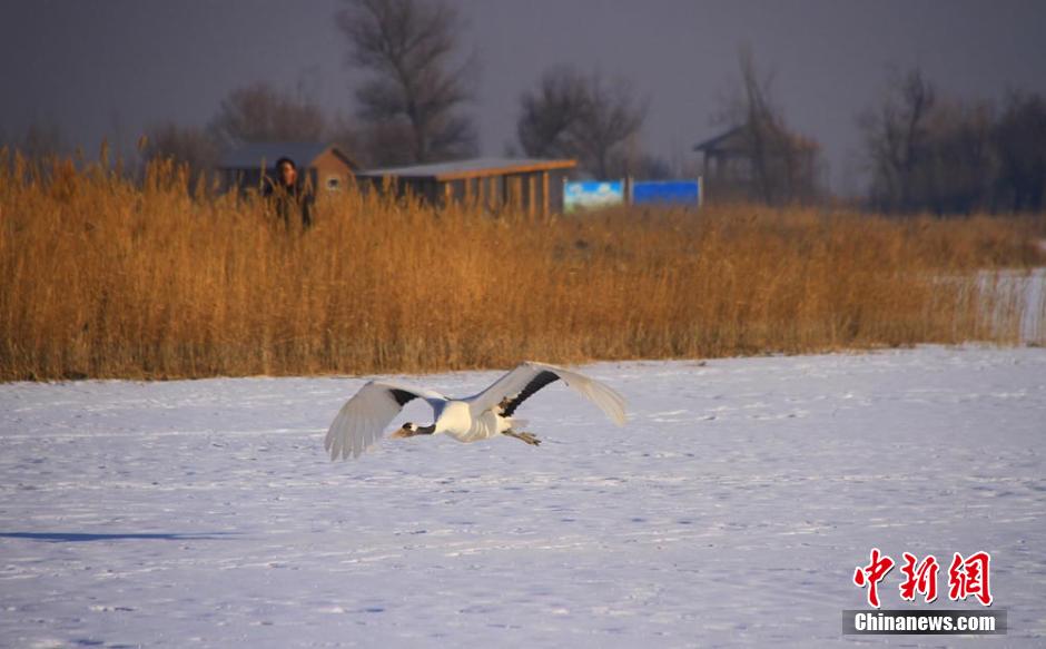 2月9日,伴着朝阳,国家一级保护动物丹顶鹤在地处甘肃河西走廊的张掖国家湿地公园“闲庭散步”、“起舞”游玩。2014年3月,张掖国家湿地公园从黑龙江齐齐哈尔扎龙自然保护区引进14只国家一级保护动物丹顶鹤和2只白头鹤。经过近一年的适应期、合群期,现在有11只丹顶鹤进入放飞期。随着羊年春节的到来,丹顶鹤开始放飞并与游人见面。(陈礼摄)