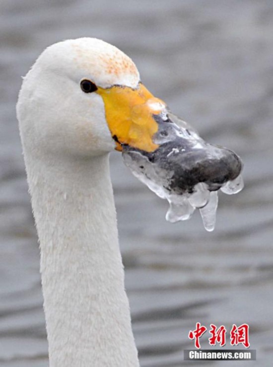 2月4日,新疆库尔勒市孔雀河中一只天鹅,不知为何原因天鹅的嘴被冰冻住了根本张不开,有不少市民向河里投食,天鹅野鸭都相争来夺食,而这只天鹅只能眼睁睁看着美味从嘴边溜走自己却抢不到,它那充满求助的眼神甚是可怜。中新社发 布仁托古斯 摄