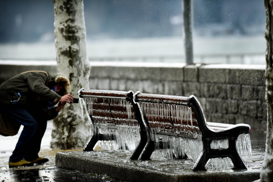 当地时间2月6日,韦尔苏瓦镇莱蒙湖河堤上的座椅披上了“冰柱造型”,路人也拿起手机拍下这壮观景象。(网站截图)