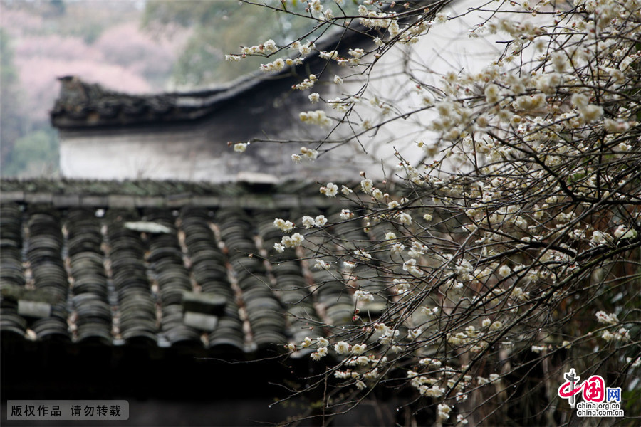 “墙角一枝梅,凌寒独自开。”徽派建筑中粉墙黛瓦下伸出的枝枝梅花,无不验证了千古流传的咏梅绝句,衬托出冰雪傲霜性格。中国网图片库 吴孙民/摄