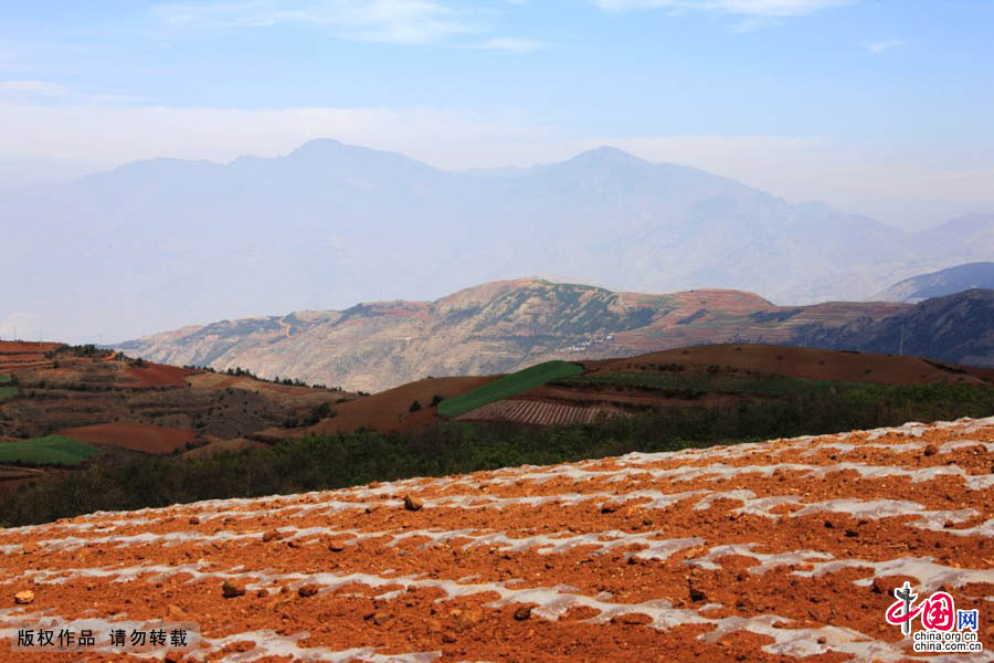 2015年3月1日,云南东川红土地,远远看去,仿佛上天涂抹的色块,色彩斑斓炫目、艳丽饱满,有着优美的线条,又勾画得如此浓墨重彩。中国网图片库 作者:韩加君