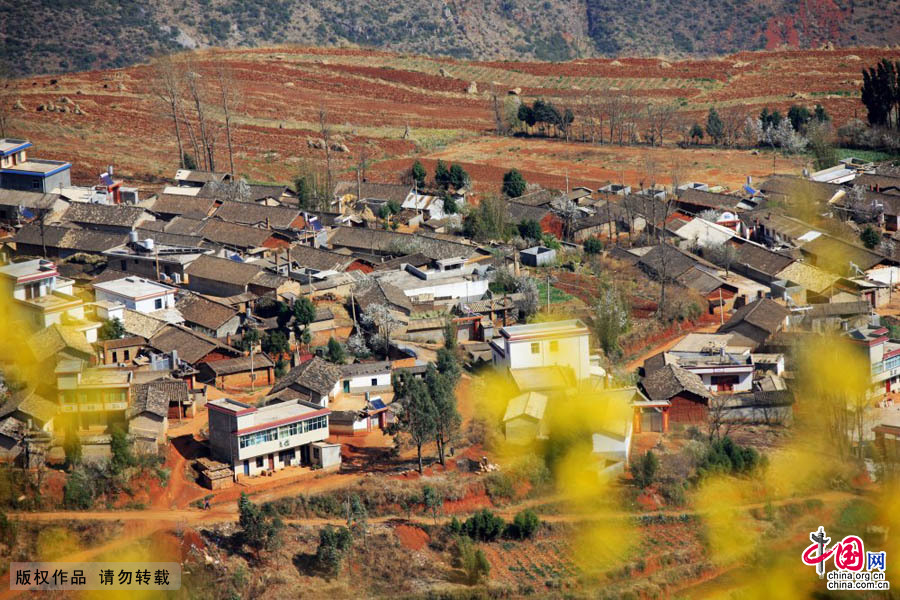 2015年3月1日,云南东川红土地,远远看去,仿佛上天涂抹的色块,色彩斑斓炫目、艳丽饱满,有着优美的线条,又勾画得如此浓墨重彩。中国网图片库 作者:韩加君