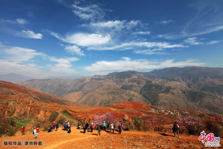 2015年3月1日,云南东川红土地,远远看去,仿佛上天涂抹的色块,色彩斑斓炫目、艳丽饱满,有着优美的线条,又勾画得如此浓墨重彩。中国网图片库 作者:韩加君
