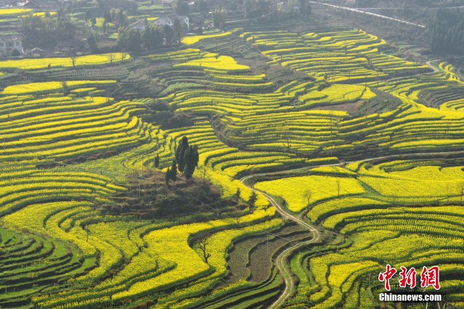 阳春三月,贵州省遵义市余庆县大乌江镇红渡村梯田中的油菜花竞相开放,层层叠叠的梯田形成一幅美丽的画卷,吸引了众多游客和摄影爱好者。图为3月14日拍摄油菜花梯田。中新社发贺春雨 摄