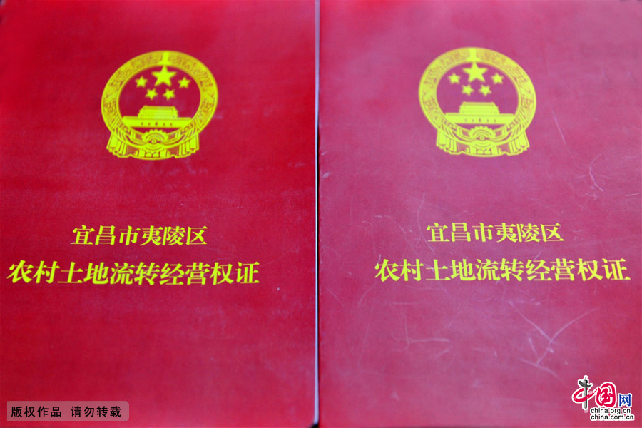 2015年3月15日,湖北省宜昌市夷陵区政府为下堡坪乡高山云雾土地股份合作社颁发的1号和2号《农村土地流转经营权证》封面。中国网图片库 作者:张国荣