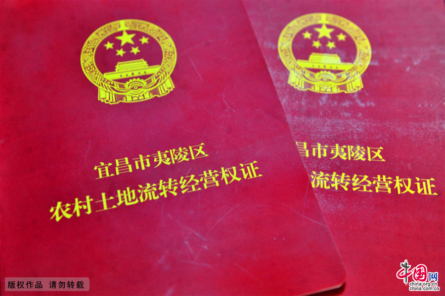 2015年3月15日,湖北省宜昌市夷陵区政府为下堡坪乡高山云雾土地股份合作社颁发的1号和2号《农村土地流转经营权证》封面。中国网图片库 作者:张国荣