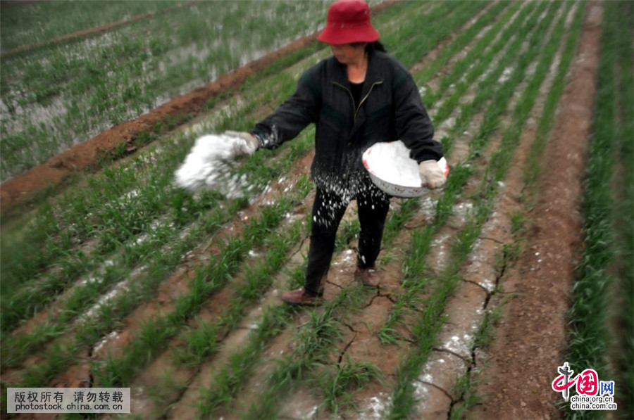 3月31日,山东省聊城市茌平县贾寨镇的农民冒雨在田间给小麦施肥。中国网图片库 赵玉国/摄