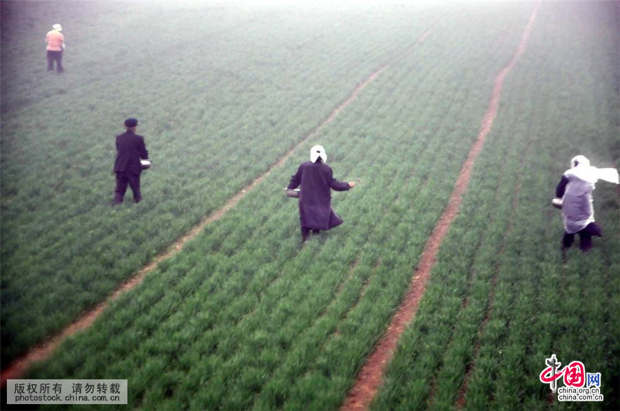 3月31日,山东省聊城市茌平县贾寨镇的农民冒雨在田间给小麦施肥。中国网图片库 赵玉国/摄