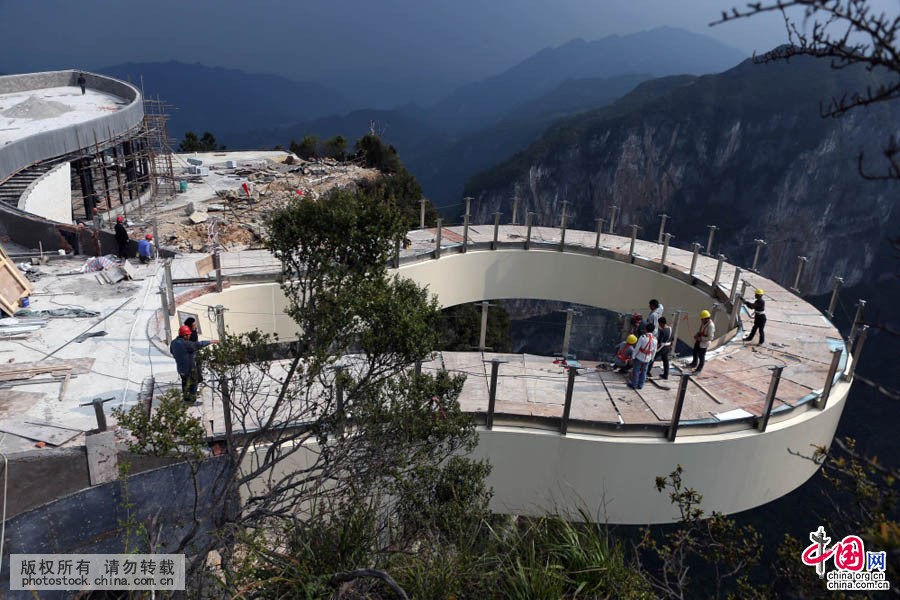 重庆云阳龙缸景区的工人正在悬挑玻璃廊桥上加紧施工,被称为“世界第一悬挑玻璃廊桥”的云阳龙缸景区二期项目“云端廊桥”已基本建成,5月1日将正式向游客开放。中国网图片库 作者:刘兴敏