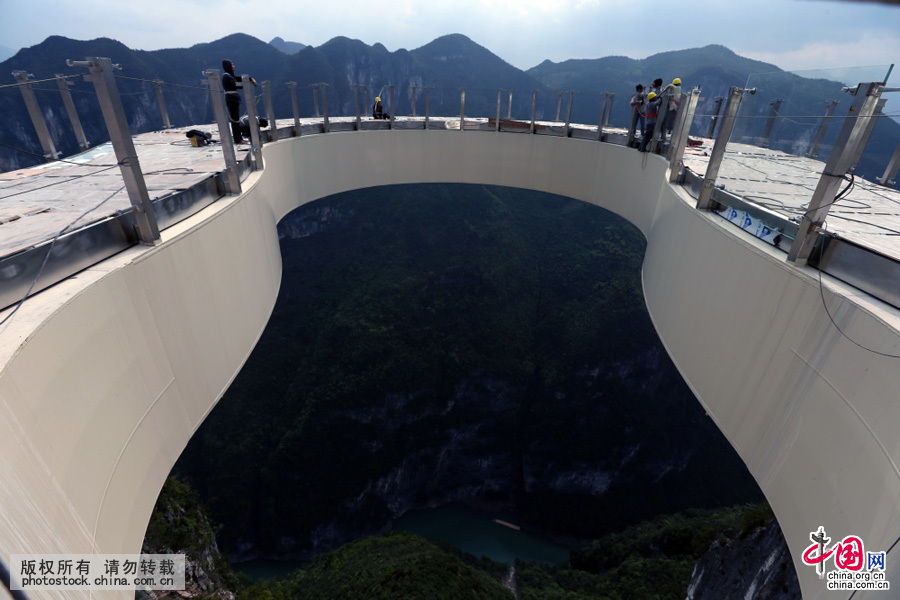 重庆云阳龙缸景区的工人正在悬挑玻璃廊桥上加紧施工,被称为“世界第一悬挑玻璃廊桥”的云阳龙缸景区二期项目“云端廊桥”已基本建成,5月1日将正式向游客开放。中国网图片库 作者:刘兴敏