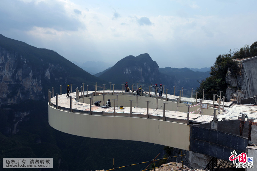 重庆云阳龙缸景区的工人正在悬挑玻璃廊桥上加紧施工,被称为“世界第一悬挑玻璃廊桥”的云阳龙缸景区二期项目“云端廊桥”已基本建成,5月1日将正式向游客开放。中国网图片库 作者:刘兴敏